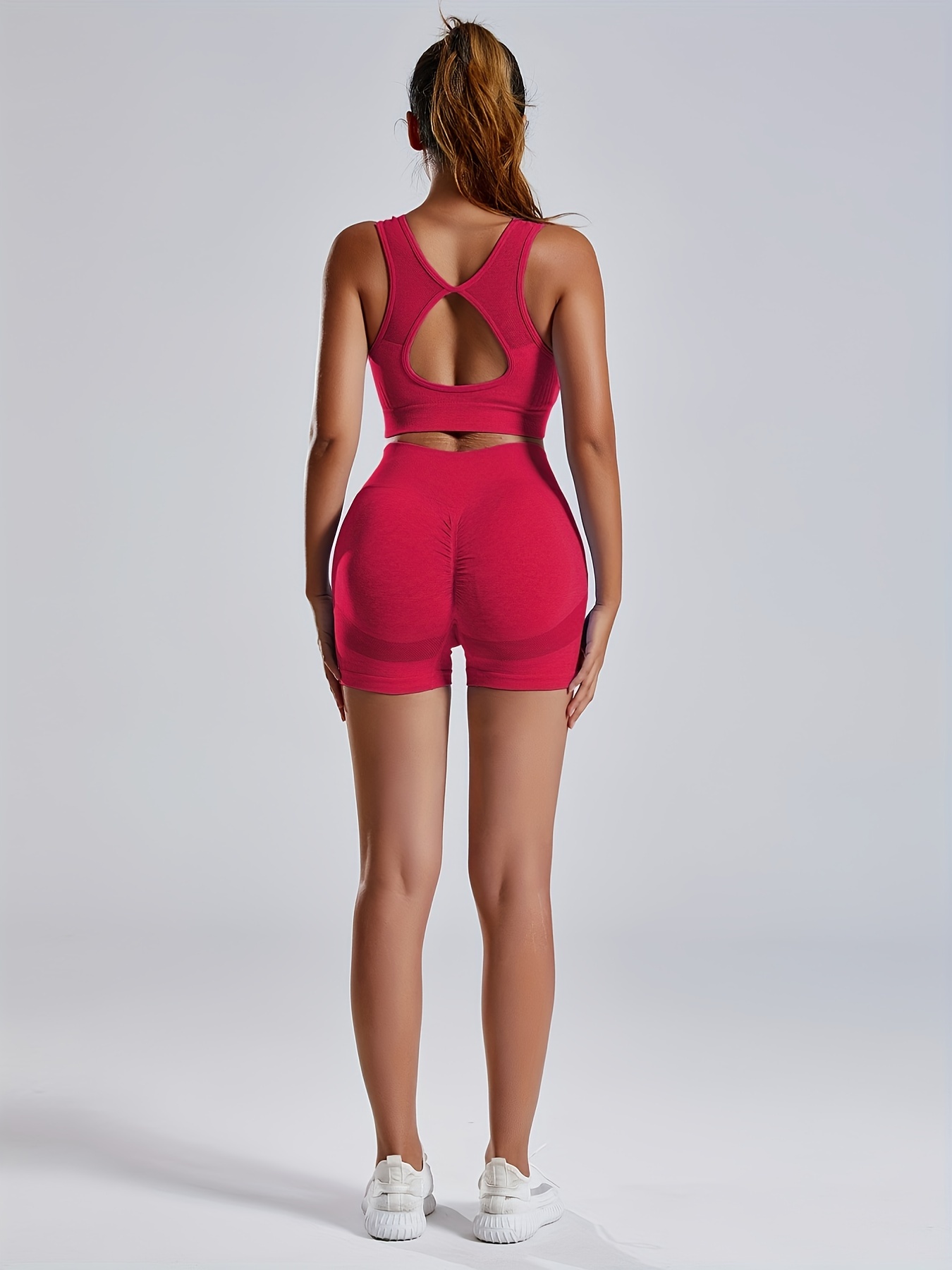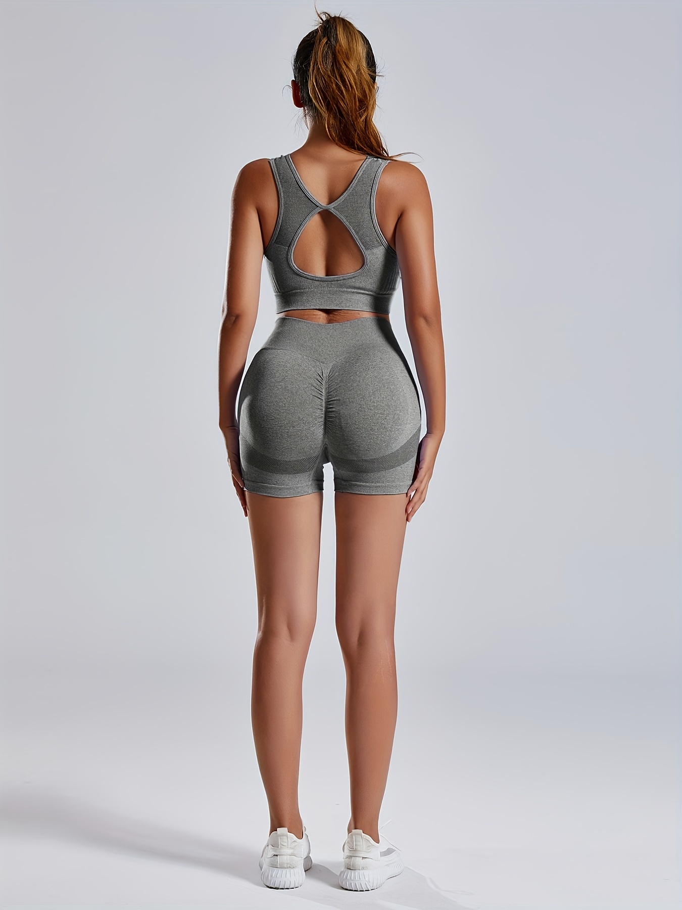 1set Women'S Seamless Sports Yoga Set - High Stretch Polyamide & Elastane Knit Fabric, Solid Color, All-Season, Regular Fit, Open Back Sports Bra & Butt Lifting Shorts Gym Wear