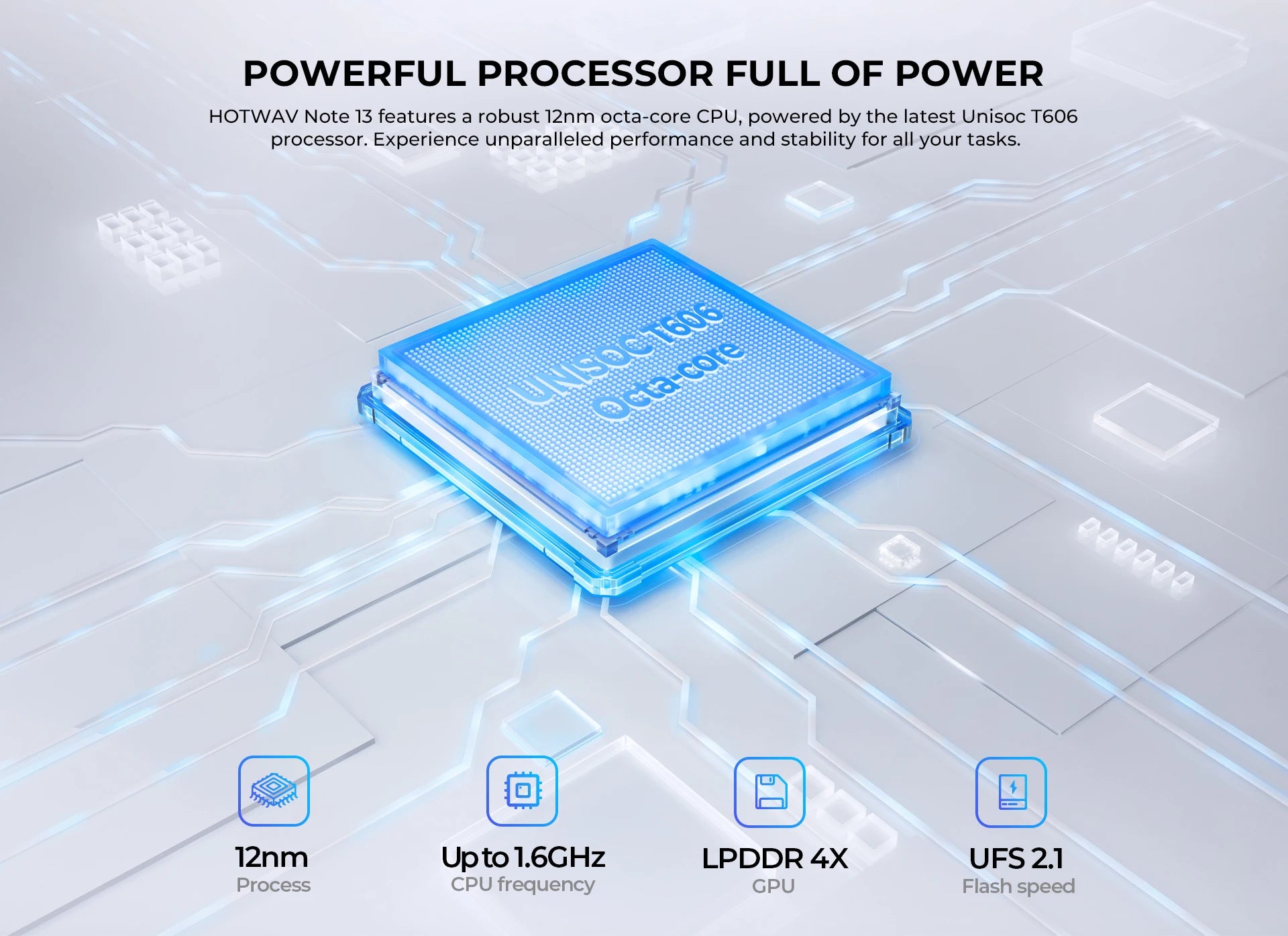 HOTWAV Note 13 features a robust 12nm octa-core CPU, powered by the latest Unisoc T606 processor. Experience unparalleled performance and stability for all your tasks.