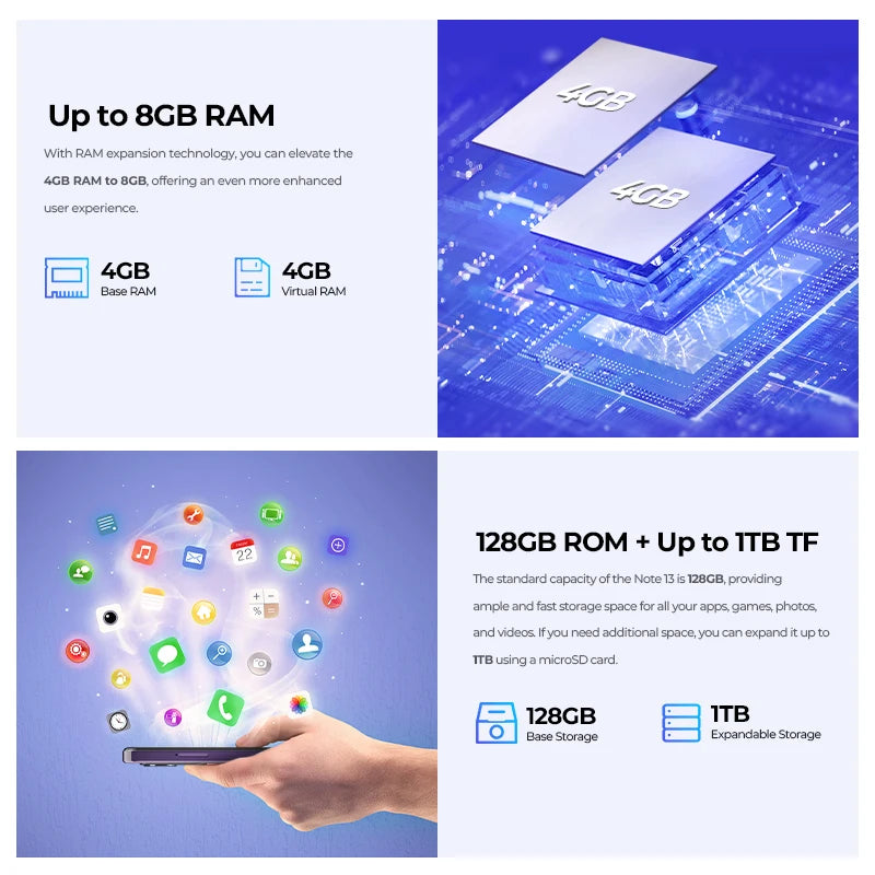 The standard capacity of the Note 13 is 128GB, providing ample and fast storage space for all your apps, games, photos, and videos. If you need additional space, you can expand it up to 1TB using a microSD card.