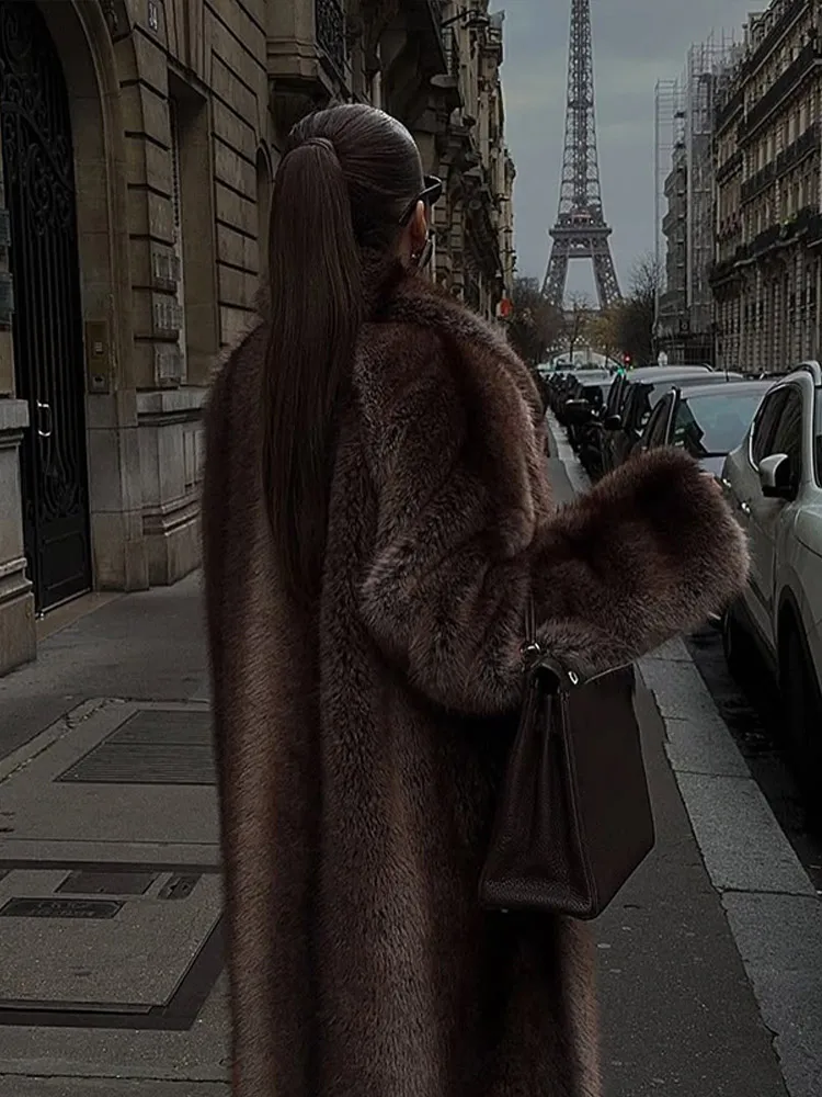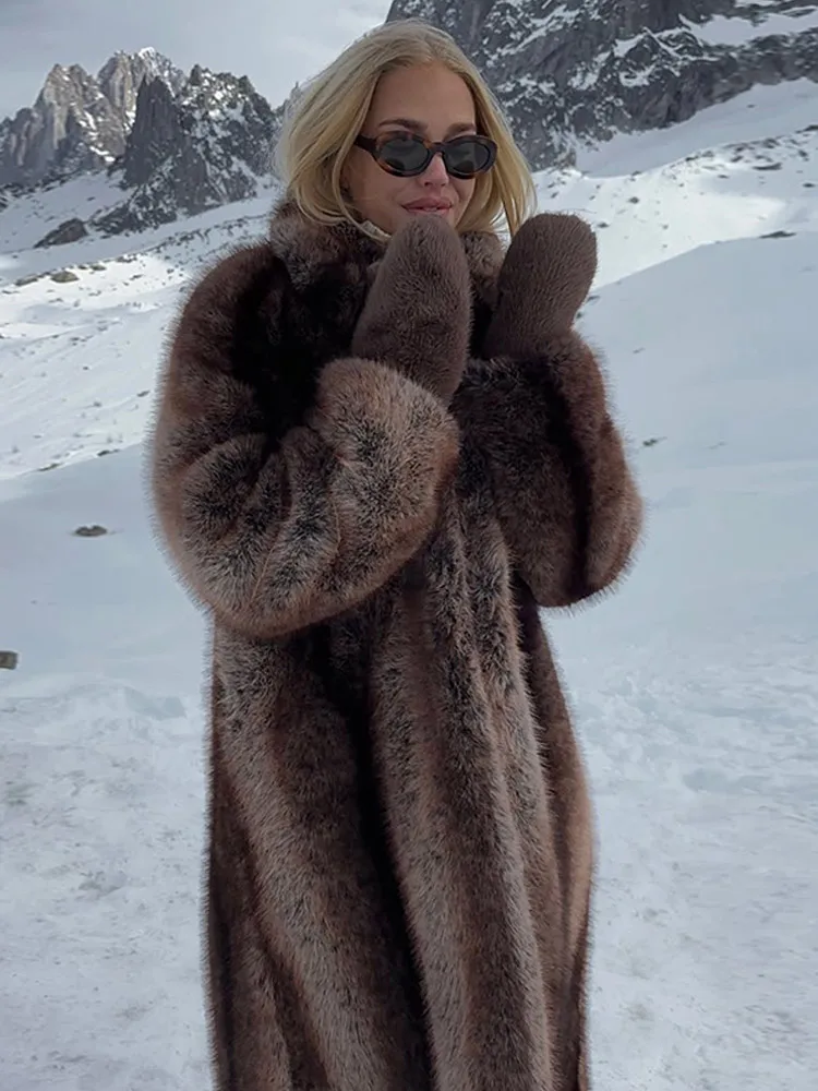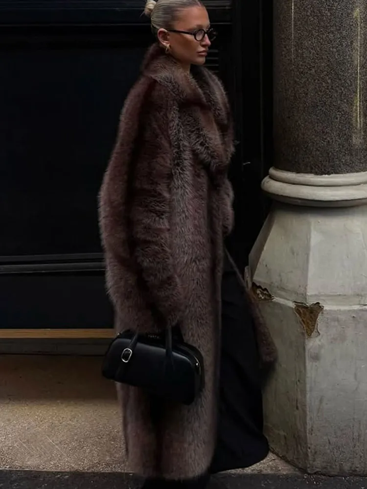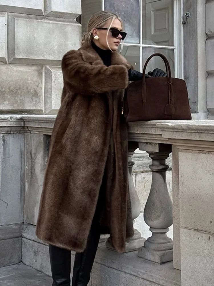 Women Brown Faux Fur Coat Shawl Collar Solid Full Loose Outerwears 2025 New Winter Fashion Street Commute Evening Event Lady Top