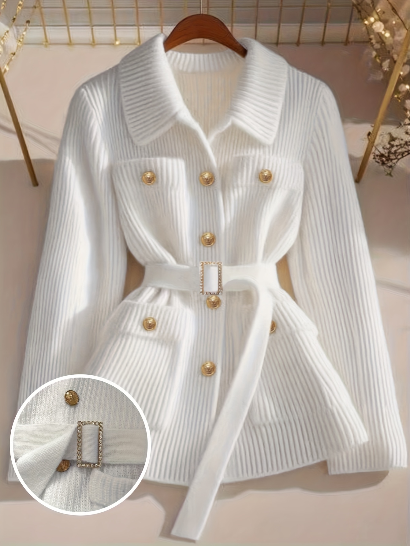 Women's Elegant Collar Blazer Jacket with Belted Waist & Pocket - Solid Beige Summer Coat, Machine Washable, Medium Elasticity for Casual & Professional Wear