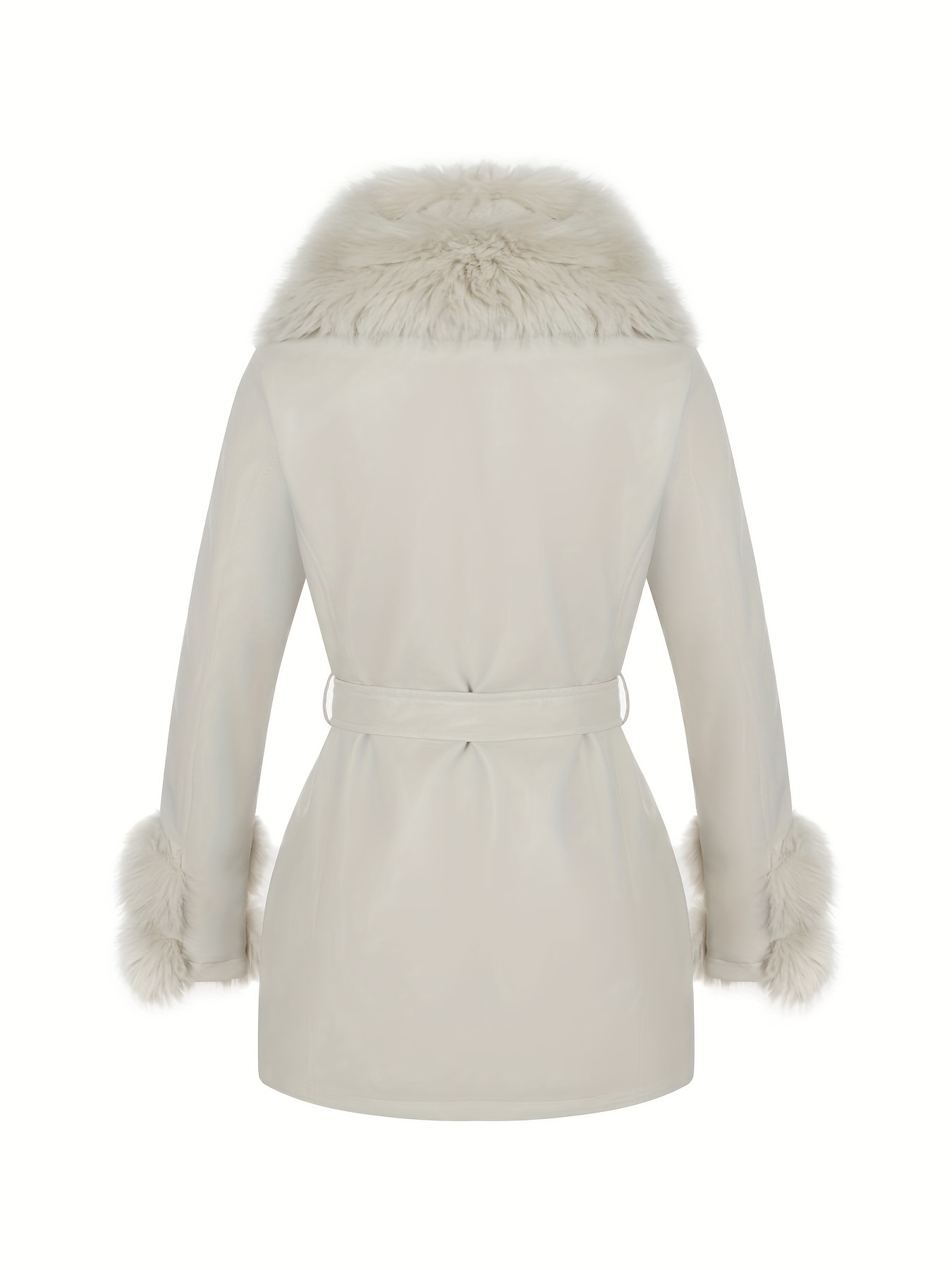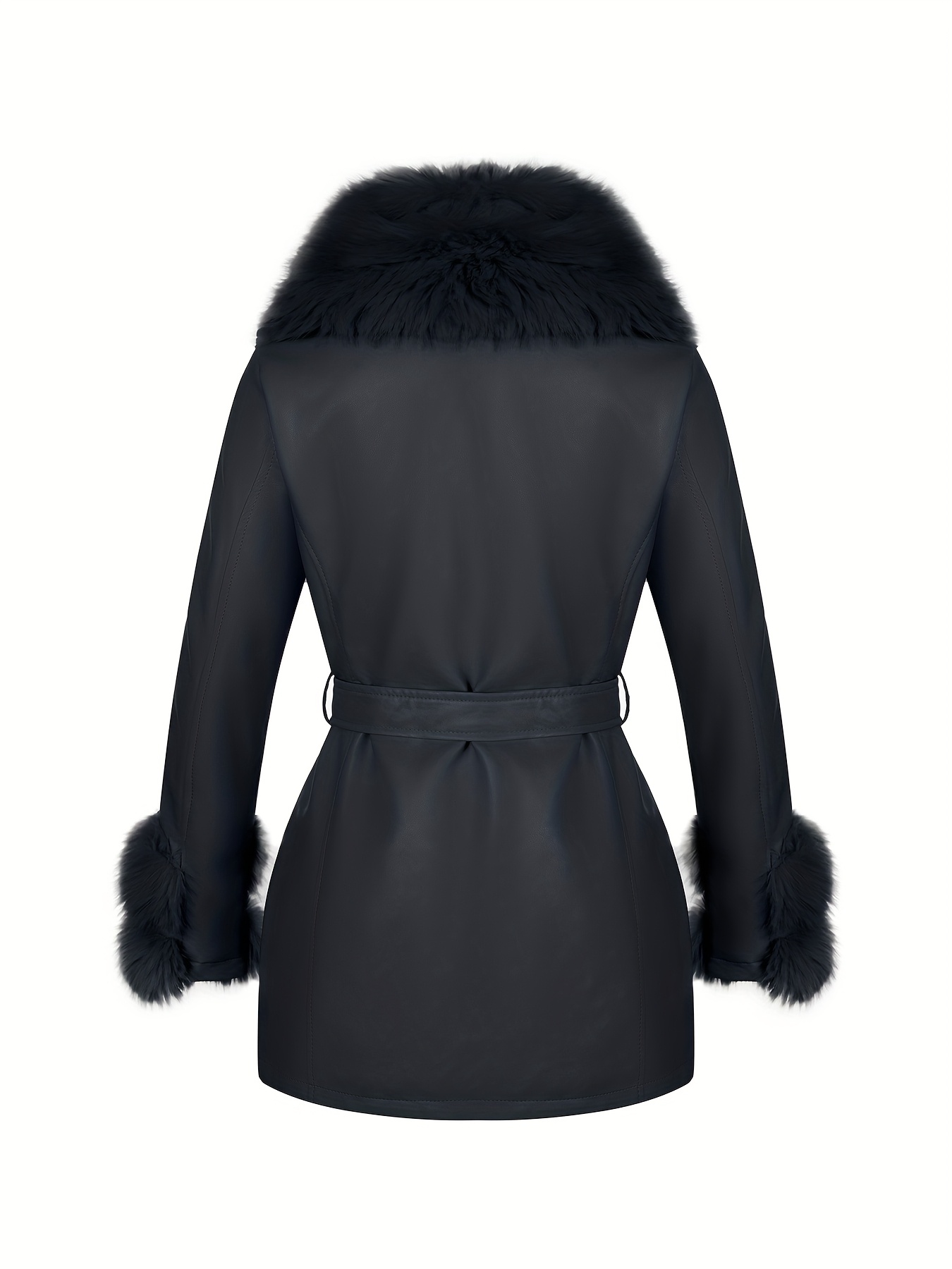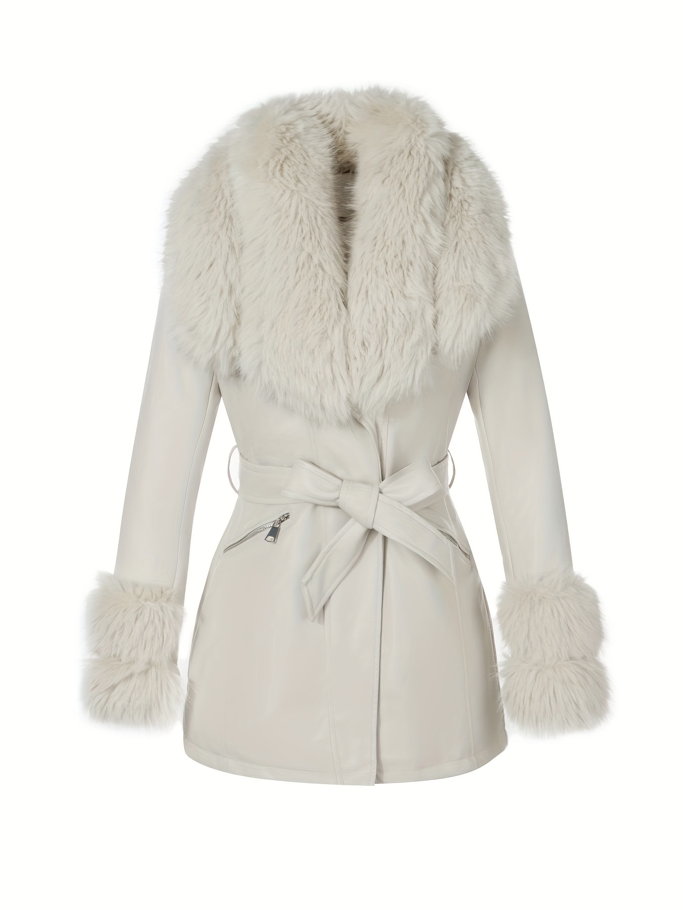 Women's Elegant Winter Jacket with Detachable Fake Fur Collar & Lapel - Belted Coat, Solid Color Long Sleeve Outerwear for Fall/Winter, Non-Stretch for Dresses/Skirts/Jeans