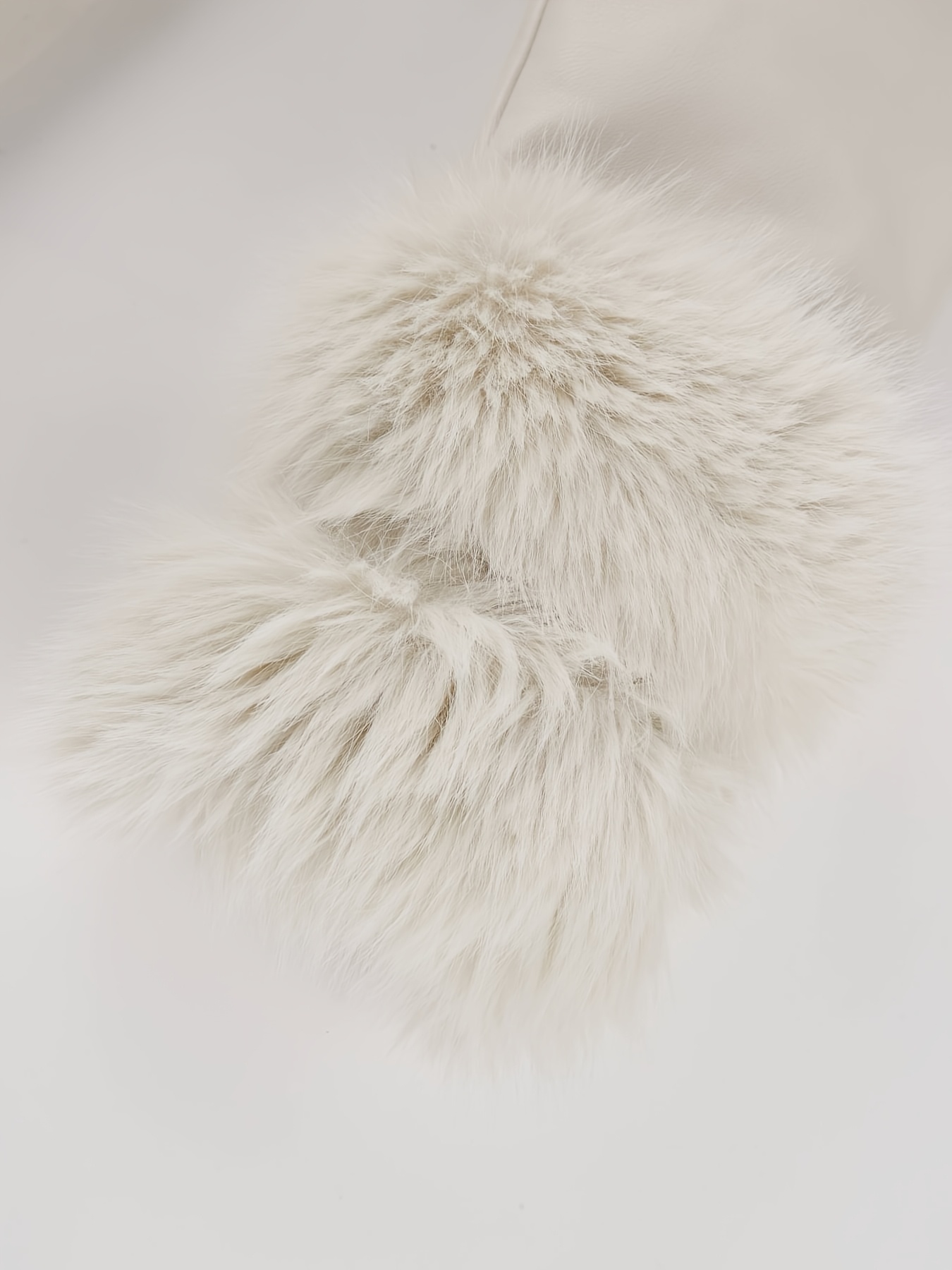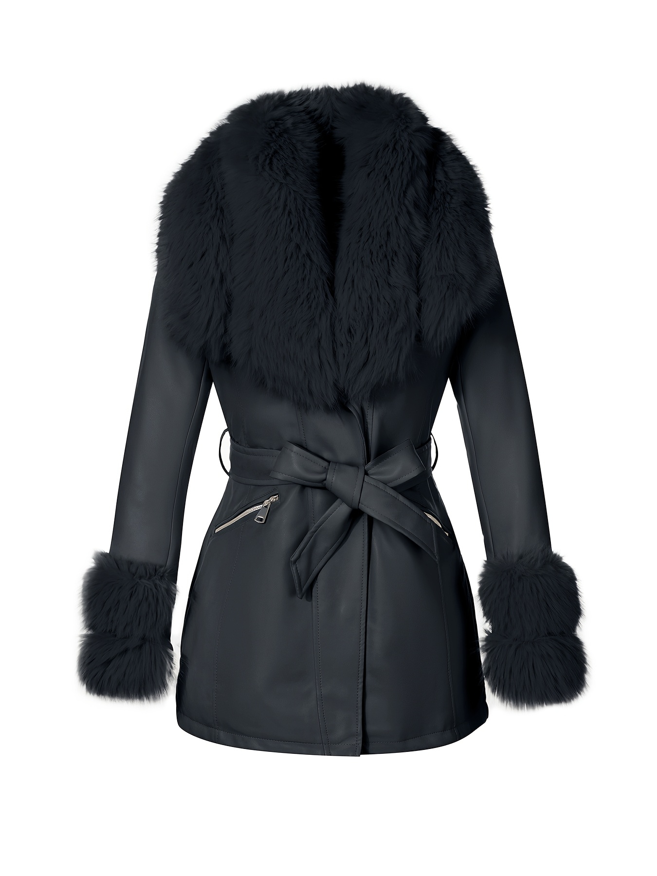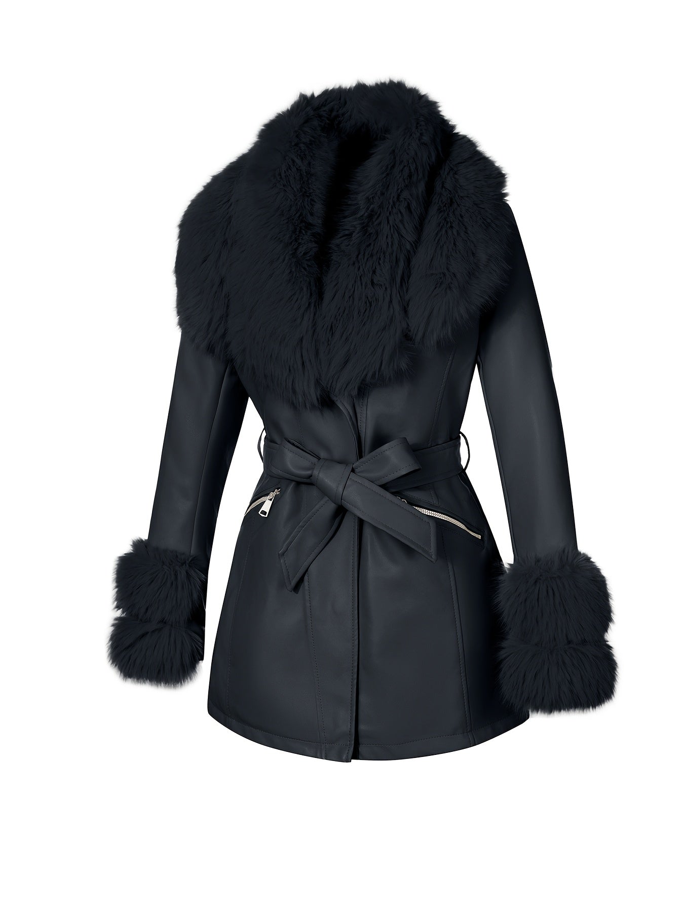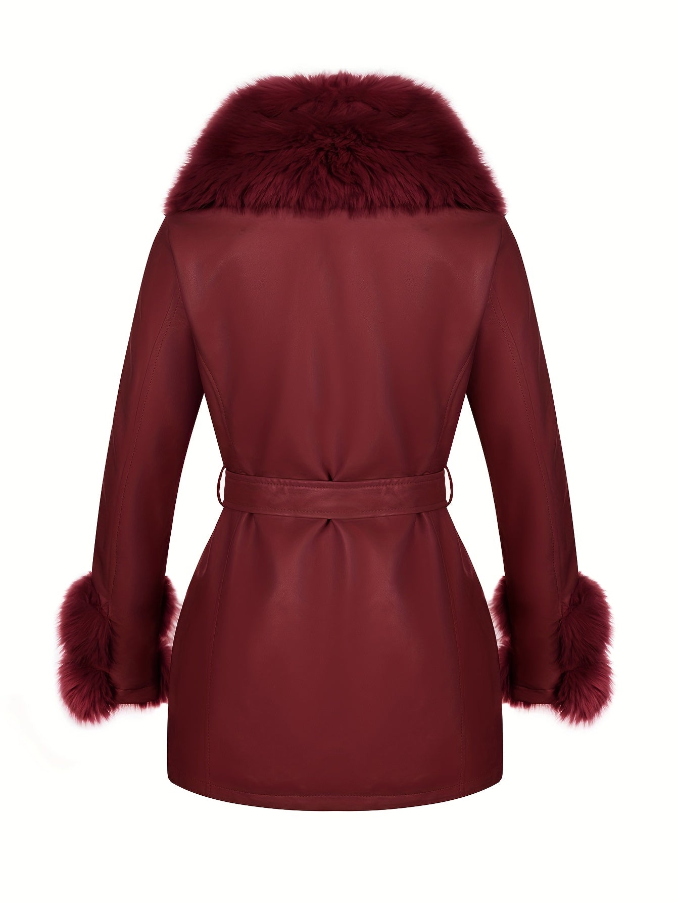 Women's Elegant Winter Jacket with Detachable Fake Fur Collar & Lapel - Belted Coat, Solid Color Long Sleeve Outerwear for Fall/Winter, Non-Stretch for Dresses/Skirts/Jeans